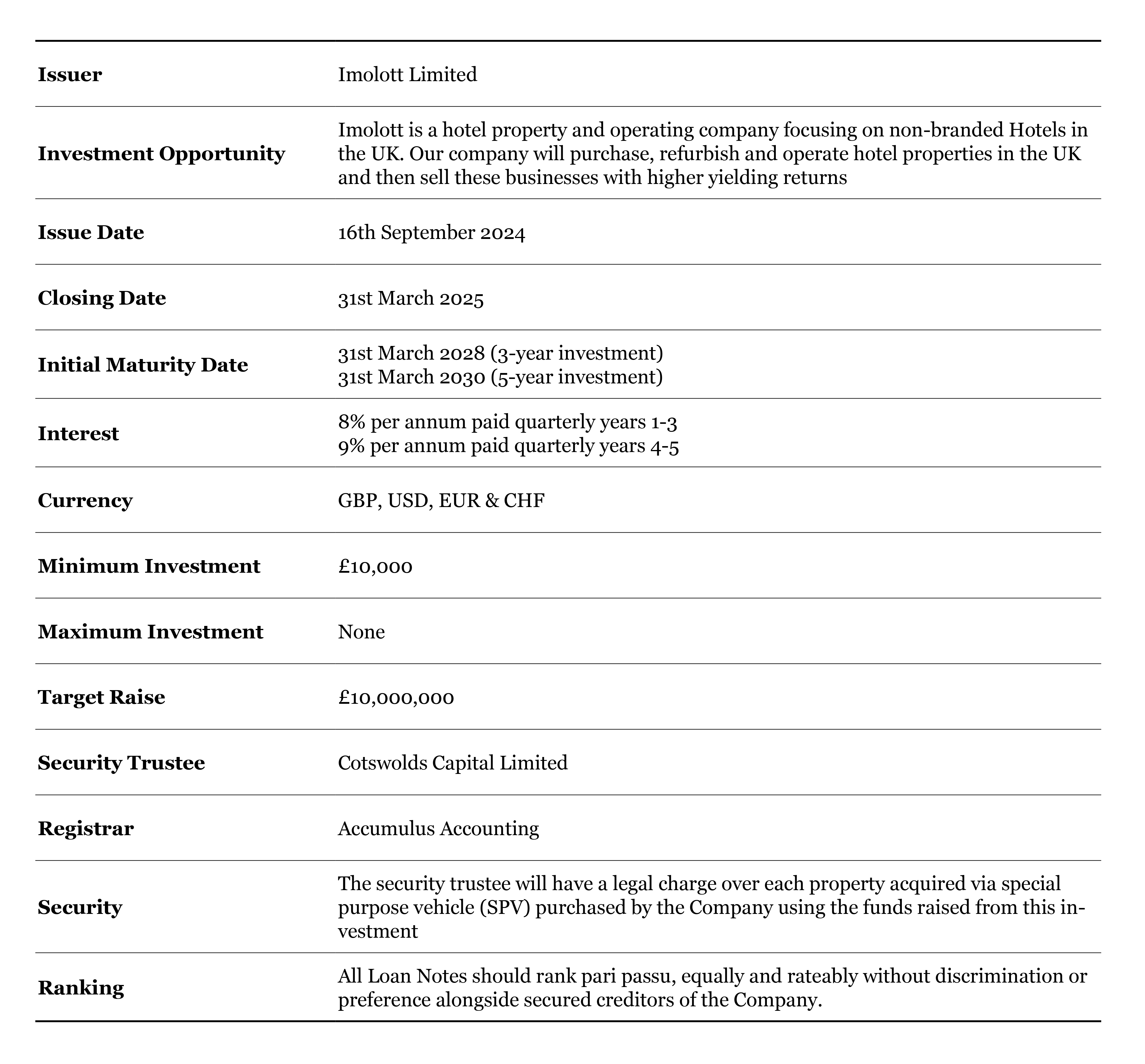 The investment is secured by way of a fixed legal charge (see above) over the hotel properties purchased using the proceeds of these Loan Notes. Loan Noteholders rank in priority to unsecured creditors of the Company. The presence of this security does not mean, however, that capital and returns are guaranteed. Where the Company develops or refinances the properties purchased, the finance provider could take first ranking charge and Loan Noteholders would then be granted second ranking charge over the properties purchased.
